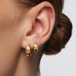 Modellen bærer Rue Mini Hoops i sit andet hul.