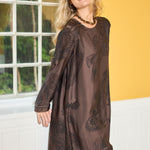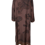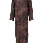 Lang kjole fra Black Colour i brun med paisley-mønster. Kjolen har en løs pasform med lange ærmer og rund halsudskæring. En slids i siden giver god bevægelsesfrihed.